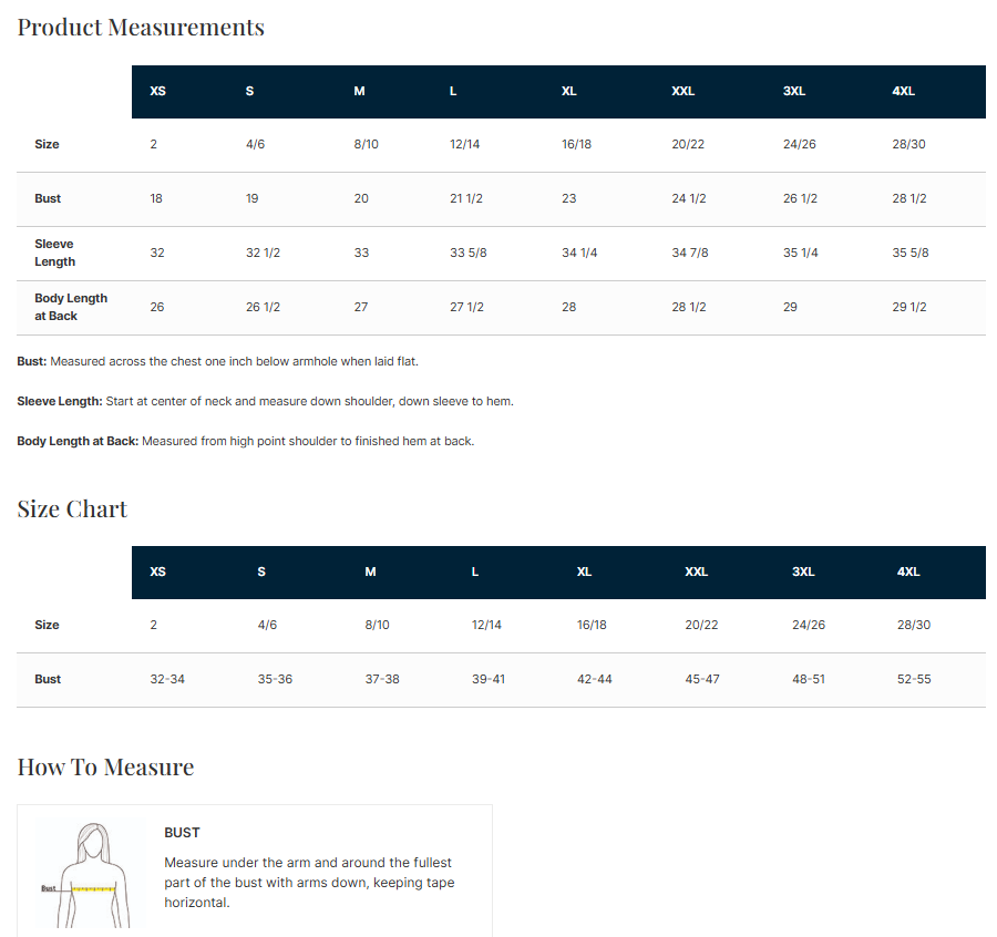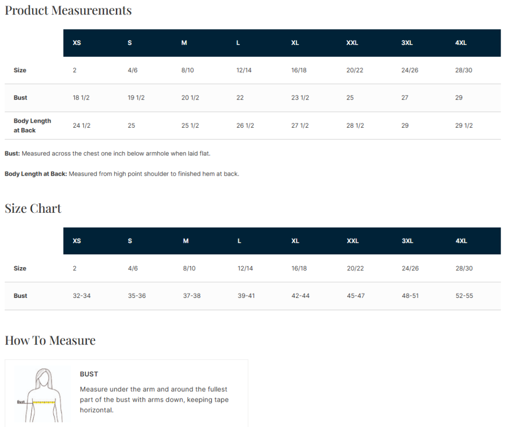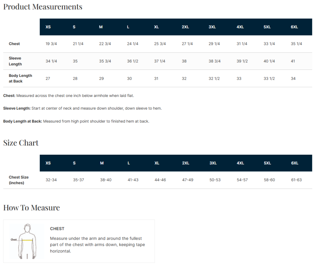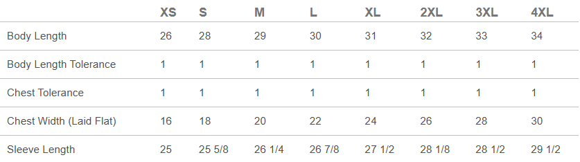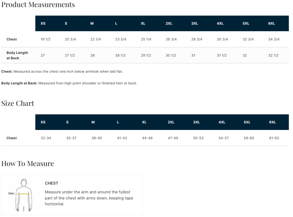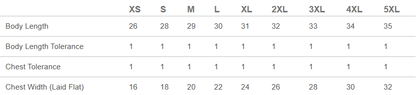 Lay garment flat. 1" below the armhole flat measure the garment across the chest.| Size | Body Length | Body Width |